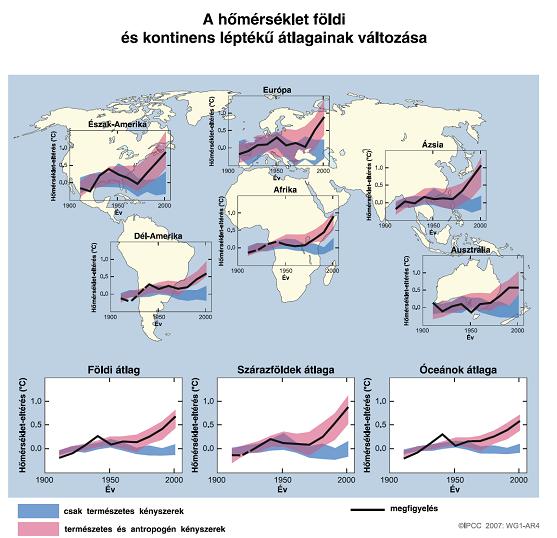 Az utóbbi 50 évben (az Antarktiszt kivéve) az összes kontinensen tapasztalt, egyértelmű melegedés csak az üvegházgázok antropogén kibocsátásának figyelembe vételével lehetséges, amit kissé korlátozott az aeroszol koncentráció ugyancsak számításba vett növekedése. A 20. század második felében a melegedést már nagy valószínűséggel az emberi tevékenység okozta, a megfigyelt értékek ekkor ugyanis már nagyon eltérnek a csak természetes okok és a belső ingadozás hatására szimulált értékektől az Antarktiszt kivéve minden kontinensen, továbbá földi átlagban, valamint külön-külön a kontinensek és az óceánok felett is. Ha az antropogén hatást is hozzáveszik a modellszámításhoz, akkor viszont mindenhol sikeres a szimuláció (2. ábra).