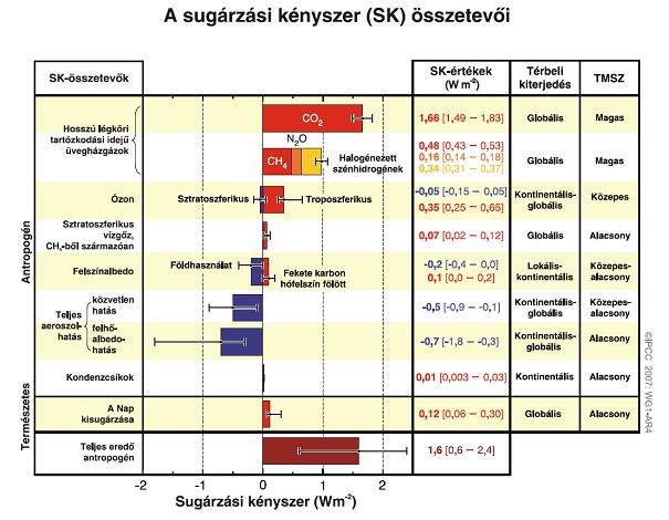 A föld-légkör rendszert ért sugárzási kényszer (SK) a különböző antropogén és természetes hatások miatt 1750-től 2005-ig.