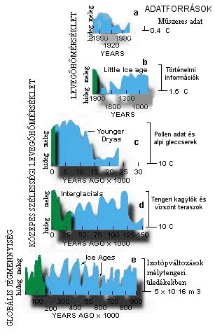 A 3. ábrán összefoglalva, az 1. ábrán láthatónál részletesebben mutatjuk meg az éghajlat ingadozásának mértékét és időtartamait. Az utóbbiak azért lényegesek, hogy lássuk, a napjainkban zajló, nagy valószínűséggel antropogén eredetű változás mértéke korántsem rendkívüli (amint fentebb írtuk, csak az utóbbi tízezer évhez képest az), a változások üteme azonban 1-2 nagyságrenddel gyorsabb lehet a korábban tapasztaltaknál.