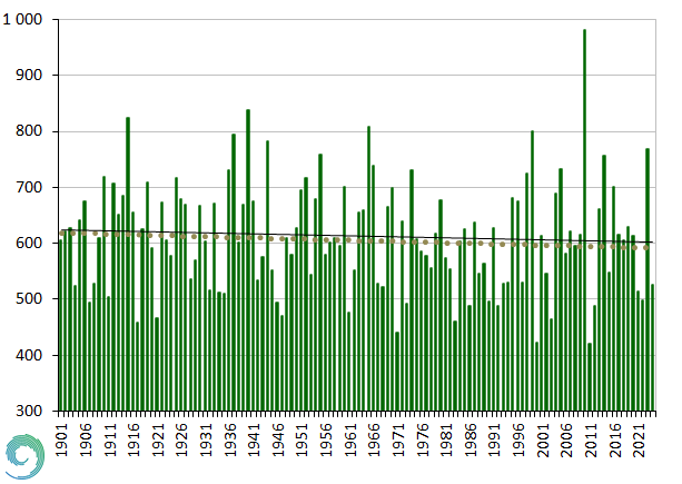 Az évi csapadékösszeg 1901 és 2024 között Magyarországon (homogenizált, interpolált országos átlag)