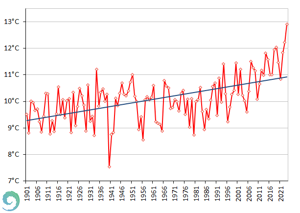 Az évi középhőmérséklet 1901 és 2024 között Magyarországon (homogenizált, interpolált országos átlag)
