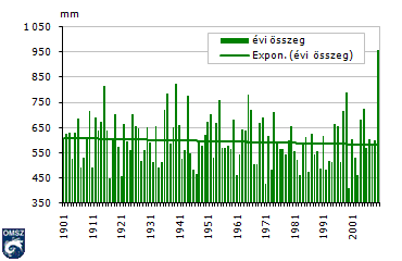 Az éves csapadékösszeg, ahogy az a 2. ábrán is látszik, minden eddigi összeget magasan túlszárnyalt. Országos átlagban 2010-ben 959 mm csapadék hullott, mely több mint 130 mm-rel haladja meg az eddigi rekordot, az 1940-es 824 mm-es éves hozamot. Ilyen csapadékos év jó közelítéssel 3 tízezred valószínűséggel fordul elő. Az illesztett exponenciális trend alapján gyenge csökkenés rajzolódott ki az elmúlt 110 évben, míg az 1981-2010-es időszakban szignifikáns, mintegy 25%-os növekedés volt jellemző.
