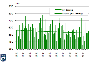 Az országos évi csapadékösszegek 1901 és 2009 között
