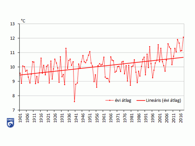 Magyarországon az évi középhőmérséklet jelentősen meghaladta az eddigi legmelegebb 2014-es évet (1. ábra). Az országos középhőmérséklet 2018-ban mintegy 1,8 °C-kal haladta meg az 1981-2010-es sokévi átlagot és 12,07 °C-os középhőmérsékleti értékkel a legmelegebbnek bizonyult az ellenőrzött, homogenizált (MASHv3.03) és interpolált (MISH v1.03) 1901-től kezdődő éghajlati idősorban. Az évi középhőmérséklet országos átlaga 90%-os megbízhatósági szinten szignifikánsan emelkedik az 1901-től kezdődő hosszú idősor lineáris trendvizsgálata (1. ábra) alapján. Az évi középhőmérséklet országos átlagának változása az elmúlt 118 év alatt átlagosan +1,23 °C-nak adódott, míg 1981 és 2018 között +1,76 °C-nak. A 90%-os megbízhatósági szinten a konfidencia intervallum az 1981-2018 közötti változásra [1,55 °C; 2,10 °C].