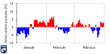 A hónap elsõ hetében folytatódott a felmelegedés. A napi átlaghõmérséklet 7-én érte el maximumát, ekkor 6 fokkal volt a sokévi átlag fölött. Ezután erõteljes lehûlés kezdõdött, az értékek a normál alá süllyedtek. A leghidegebb, országos átlagban -4°C 19-én volt. A hónap végén újra pozitív tendencia volt jellemzõ, és az utolsó két napon az értékek újra az átlag fölött helyezkedtek el.