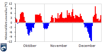 A hónap elején, egészen november 6-ig a vártnál alacsonyabb volt a napi középhõmérséklet országos átlagban, a legnagyobb negatív eltérés 1-jén jelentkezett, mely abszolút értékben a 6°C-ot is meghaladta. November 7-tõl az értékek a hónap végig átlag felettiek voltak. A legnagyobb pozitív különbség (közel 7°C) 30-án jelentkezett, ekkor 10,5°C-os minimumhõmérsékletet regisztráltunk Pápán, mely ezen a napon eddig a legmagasabb minimumérték.