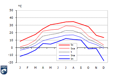 A napi országos középhõmérsékletek alapvetõen az átlag felett helyezkedtek el, csupán néhány napra csillapodott a kánikula. 10-én volt a legnagyobb negatív eltérés országos átlagban (-3°C). A leghidegebbet 27-én mérték, 4,1°C-t, amely az eddig mért legalacsonyabb hõmérséklet ezen a napon, és a mérés helye ismételten Zabar állomásunk volt. A maximális pozitív anomália 23-án adódott (+6°C). Ekkor mértük a hónap és egyben az év legmagasabb hõmérsékletét is, 37,2°C-ot Kiskunhalason.