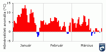 középhõmérséklete is jóval átlag felett alakult, országosan mintegy 3,9°C-kal volt magasabb a szokásosnál. A hónap során, országos átlagban csak 1 nap napi középhõmérséklete maradt átlag alatt, február nagy részében az átlagot 1-6 fokkal meghaladó napi középhõmérsékleteket mértek.
