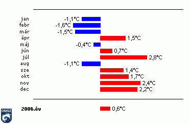 Az országos havi középhőmérséklet eltérése a sokévi (1961-90-es) átlagtól 2006-ban