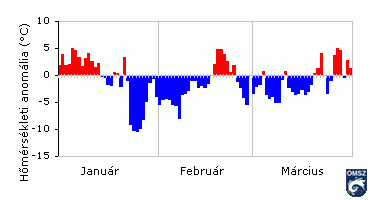 az év elsõ két hónapjához hasonlóan több mint 1 fokkal hidegebb volt a sokévi átlagnál, a hónap középhõmérséklete országos átlagban 3,6 °C-nak adódott. A negatív anomália túlnyomórészt a március elsõ felében uralkodó, az átlagosnál 3-5 fokkal hidegebb idõszaknak volt köszönhetõ: március 20-ig a napi középhõmérséklet mindössze két napon haladta meg a normálértéket. A hónap végén aztán beköszöntött a tavasz, március 27-én az északnyugati országrészben a 25 °C-ot is meghaladta a legnagyobb nappali felmelegedés.