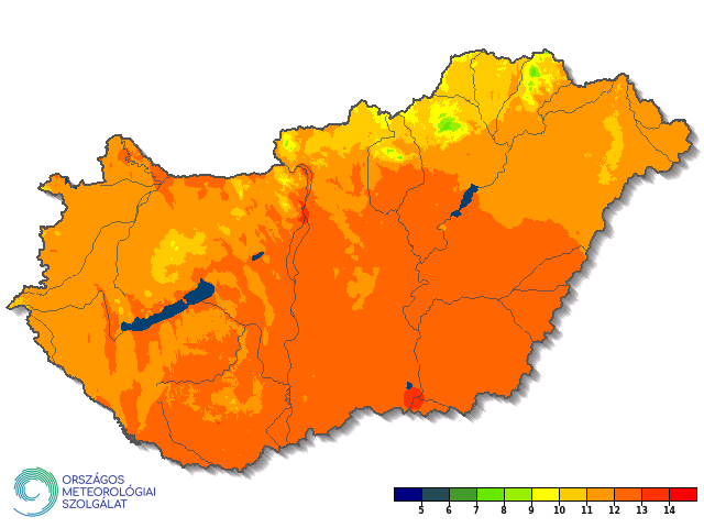 Az év fontos jellemzője az éghajlati indexek számának alakulása, például a hideg és a meleg küszöbnapok száma. Fagyos napból (Tmin ≤ 0 °C) 89 nap volt, ez 1 nappal kevesebb az 1991- 2020-as normálnál. Téli napból (Tmax ≤ 0 °C) 6 nap adódott a szokásos 24 helyett. A zord napok (Tmin ≤ -10 °C) száma mindössze 3 volt, míg a normál 8 nap. Zabar állomáson volt a legtöbb, itt 26 napot regisztráltunk. A nyári napok száma (Tmax ≥ 25 °C) 103 volt, ami jelentősen - több mint két héttel - haladta meg az 1991-2020-as átlagot (87 nap). A hőhullámos napok (Ta ≥ 25 °C) területi eloszlását mutató 10. ábra szerint 2022 nyarán az Alföld jelentős részén 30-35 hőhullámos nap fordult elő, és még ennél is több (35-40 nap) adódott CsongrádCsanád vármegyében. 2022-ben hőségnapból (Tmax ≥ 30 °C) a normálnál (29 nap) jóval többet, összesen 48 napot jegyeztünk. Kübekháza gátőrház állomáson volt a legtöbb, összesen 14 79 hőségnap jelentkezett. A forró napok száma (Tmax ≥ 35 °C) országos átlagban 8 nappal több volt, mint az 1991-2020-as átlag (3 nap).
