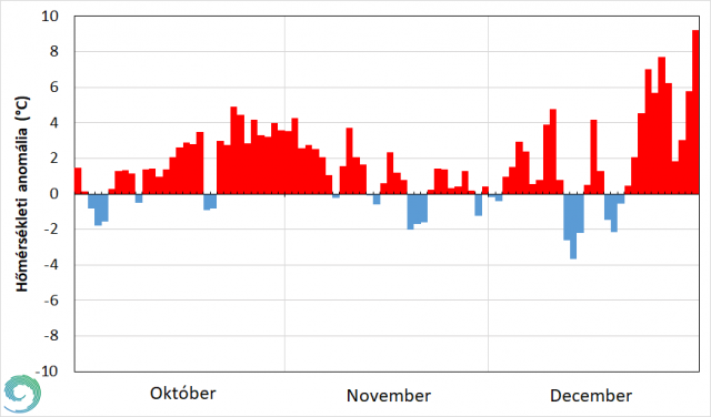 Decemberben 3 rövid kis időszak kivételével a szokásosnál magasabban alakult a napi középhőmérséklet országos átlaga. A teljes hónapot tekintve, az elején még csak kisebb mértékű, a végén pedig már nagyobb arányú volt a pozitív eltérés a sokéves átlagtól. December kezdetén az átvonuló frontok és ciklonok alakították időjárásunkat, hatásukra enyhe, nedves levegő áramlott fölénk. Ekkor 1-3 °C-kal volt melegebb a normálnál. Majd 7-én és 8-án egy frontálzóna mögött hidegebb levegő érkezett a Kárpát-medencébe, így a megszokotthoz közeli napi átlagok voltak a jellemzőek. Az ezt követő 3 napban mediterrán ciklonok helyeződtek hazánk fölé, ismét igen enyhe légtömegeket hozva. December 10-én már 5°C-kal volt magasabb a napi átlaghőmérséklet a sokéves értéknél. 12-től átmenetileg fagyos levegő töltötte ki a Kárpát-medencét. A hónap közepén délire forduló áramlással több hullámban érkezett hazánk fölé enyhe, nedves levegő, majd egy mediterrán ciklon is átvonult. December 16-án mintegy 4 °C-kal magasabb volt az átlaghőmérséklet a sokéves értéknél. December 18-tól száraz, hideg levegő áramlott a Kárpát-medencébe, így ismét az átlagosnál kissé hűvösebb napokban volt részünk. December 21-től fokozatos melegedés kezdődött, és az év végéig enyhe maradt időjárásunk. Karácsonykor a kontinensen átvonuló ciklonok hatására a sokéves átlagnál 5-8 °C-kal melegebb napok következtek. 27-én este egy hidegfront érte el hazánkat, ami mögött már hidegebb levegő érkezett térségünkbe, de még így is a normál felett alakult a hőmérséklet. 29-től fokozódott a nappali felmelegedés, mivel déli-délnyugati áramlással szubtrópusi légtömeg érkezett fölénk. Az év utolsó napján ismét 7,2 °C volt a napi középhőmérséklet országos átlagban, mellyel majdnem 9 fokkal múlta felül a sokéves átlagot (7. ábra).
