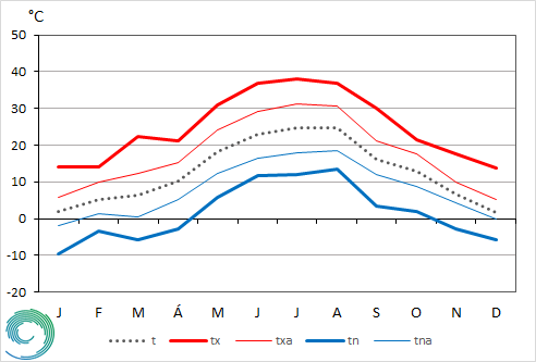 Július első napján a június végi hőhullám folytatódott, a szokásosnál több, mint 7 fokkal magasabb napi középhőmérséklettel. Másodikára virradóan egy hidegfront vonult át hazánk felett, ez pár fokkal átmenetileg mérsékelte a hőséget, de 3-án és 4-én a napi középhőmérséklet már ismét meghaladta a 25 °C-ot. 5-től kezdődően viszont fokozatos lehűlés következett, egy hétig a normál alatt maradtak az átlaghőmérsékletek. Ebben az időszakban egymást követték a hidegfrontok, 11-én erős széllel hűvös levegő áramlott térségünkbe, ekkor közel 4 °C-kal maradt el a hőmérséklet a sokéves értéktől. Ezt követően fokozatos melegedés indult meg, mivel a felettünk lévő anticiklon több napig forró, száraz levegőt jutatott kontinensünk középső területeire. Ezt a hőmérséklet-emelkedést egy 15-én érkező hidegfront törte meg, melynek hatására a következő napokban mérséklődött a nappali felmelegedés. 18-tól egy anticiklon épült ki a Kárpát-medence felett, fokozatos melegedést okozva. Ezáltal ismét a sokéves értékek fölé kerültek a napi középhőmérsékletek, a napi országos átlag 23-án már meghaladta a 28 °C-ot. Ezen a napon új országos napi maximumhőmérséklet rekord született: 41,5°C-ot regisztráltunk Hódmezővásárhely Szikáncs és Kiskunfélegyháza állomásokon. Az ezt követő napokban kisebb lehűlés következett, de még így is a sokéves értékeknél magasabb napi középhőmérsékletek jellemezték időjárásunkat. 27-29. között melegedés kezdődött, de egy érkező hidegfront véget vetett ennek. Így a hónap utolsó napjai a szokásosnál hűvösebbek voltak (6. ábra).