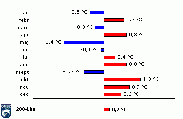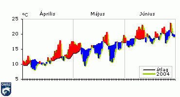 szokatlanul hûvös volt 2004-ben, Orbán napja (25-e még fagyot is hozott több helyen az országban. A hónap 9 napja volt nyári nap, amikor legalább egy mérõállomáson 25 fok fölé emelkedett a hõmérséklet, május középhõmérséklete ennek ellenére az átlagnál több mint 1 fokkal hidegebbnek, 14,0 °C-nak adódott.