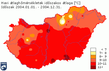 Az évi középhõmérséklet országszerte 5,6 (Kékestetõ) és 11,7°C (Szeged) között alakult (8. ábra). Az ország északi területeit kivéve 10°C felett volt az átlaghõmérséklet.