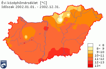 Az évi középhőmérséklet országszerte 6,9 és 12,5°C között alakult (5. ábra). A hegyvidékek és az északkeleti országrész kivételével 11°C feletti volt az átlaghőmérséklet az egész ország területén. 12°C-nál is melegebb volt a főváros belterületén és az ország néhány déli állomásán.