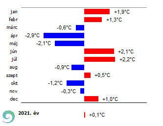 2021-ben előfordultak az 1991–2020-as sokévi átlagnál magasabb és alacsonyabb középhőmérsékletű hónapok egyaránt (3. ábra). Jobbára a téli és nyári hónapok voltak melegebbek, míg a tavaszi és őszi hónapok hidegebbek az éghajlati normálnál. A sokéves átlagtól a legkisebb eltérést novemberben és szeptemberben tapasztaltuk (-0,3°C és +0,5°C). A legnagyobb eltérések negatív irányban áprilisban és májusban adódtak (-2,9°C és -2,1°C), míg pozitív irányban júniusban és júliusban tapasztaltuk a legnagyobb anomáliákat (+2,1°C és +2,2°C). 2021 nyara az 5. legmelegebb volt 1901 óta, melyhez hozzájárult, hogy a július az 1., míg a június a 3. helyre került az 1901–2021-es időszakot felölelő sokéves adatsorban.