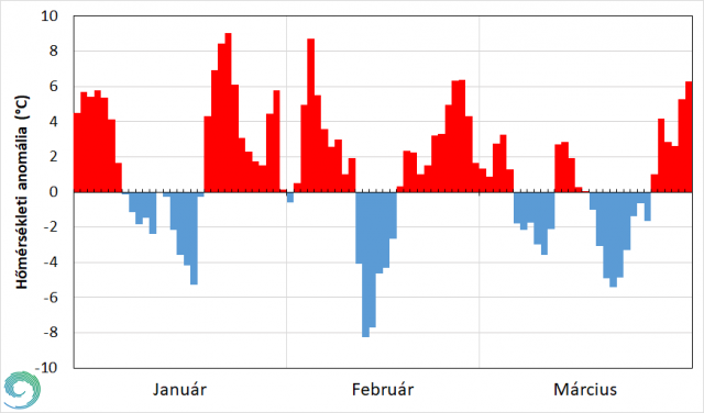 Márciusban a napi átlaghőmérséklet országos átlaga jócskán eltért a sokévi átlagtól. A hónap első napjaiban egy hatalmas kiterjedésű anticiklon alakította Európa időjárását, így a megszokottnál kicsit melegebb volt hazánkban, mint az 1991-2020-as sokévi átlag. A következő héten több hidegfront vonult át az ország felett, melyek mögött sarkvidéki eredetű levegő árasztotta el hazánkat. Ennek hatására lehűlés következett. A sokévi átlag alá csökkent a hőmérséklet, mindössze 3-4°C-kal volt hidegebb az ilyenkor szokásosnál. 12-én a csapadékkal együtt enyhébb légtömegek érkeztek a Kárpát-medencébe, de ez nem tartott sokáig. Az északias hideg áramlásnak köszönhetően térségünkben az időjárás 10 napig a sokévi átlag alatt maradt, majd a hónap utolsó hetében enyhülés következett, anticiklonális hatásoknak köszönhetően. Erősödött a nappali felmelegedés mértéke, így a hónap utolsó napjaiban 5-6 °C-kal enyhébb volt az idő, mint az ilyenkor szokásos (4. ábra).