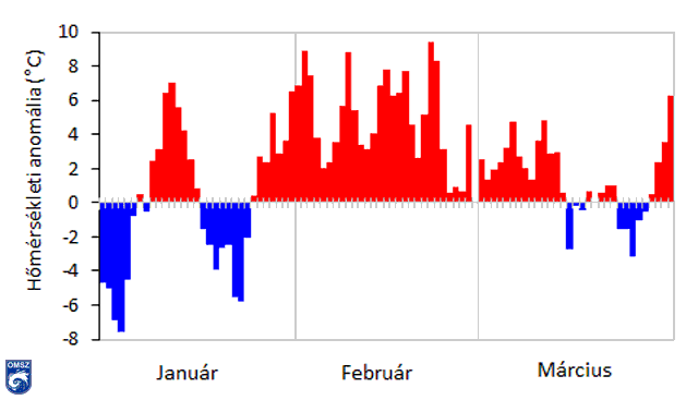 A februári középhőmérséklet +5 és 6 °C között alakult hazánk legnagyobb részén. Ennél hidegebb az Északi-középhegység magasabban fekvő területein volt, azonban még itt is fagypont felett alakultak a hőmérsékleti értékek. A sokéves átlagnál hűvösebb február sehol sem fordult elő az országban. A Bakony térségében 3 °C-kal, a Tiszántúlon és a Nyírség területén 5-6 °C-kal is meghaladta az anomália értéke az 1981-2010-es átlagot. Februárban a napi középhőmérséklet értékek is a sokéves átlag felett alakultak (4. ábra), sorra dőltek meg a napi közép- és minimumhőmérséklet maximumára vonatkozó rekordok (II. táblázat). A hónap utolsó hetét tekintve látható egy nagyobb mértékű lehűlés, amely egy átvonuló hidegfront mögött érkező hidegebb légtömegnek volt köszönhető.