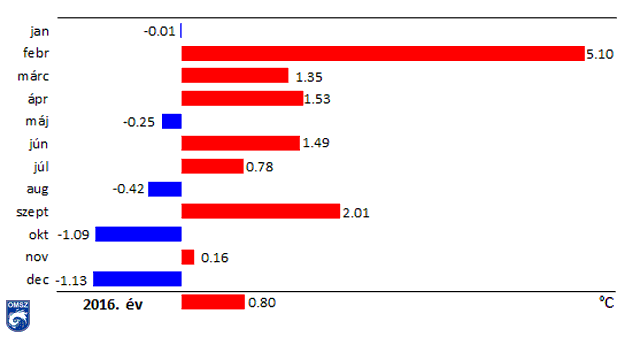 Ahogy a 3. ábrán látható, négy hónap kivételével mindegyik hónap melegebb volt a megszokottnál. A legnagyobb pozitív anomália februárban jelentkezett, a havi átlag 5,1 °C kal magasabbnak adódott a normálnál. Ezt követi a szeptember (+2,1 °C), illetve az április (+1,5 °C), és a június (+1,49 °C). Mindezek eredményeként a február az 1., a szeptember a 12., az április a 16. és a június pedig a 10. legmelegebb hónap volt 1901 óta. A januári havi középhőmérsékleti értékek megegyeznek az 1981-2010-es sokévi átlaggal. Májusban, augusztusban pár tized fokkal, októberben és decemberben több mint 1 °C-kal volt hűvösebb a szokásosnál. Ezzel együtt 2015/2016-hoz köthető a 7. legmelegebb tél a hosszú homogenizált éghajlati adatsor kezdete óta.