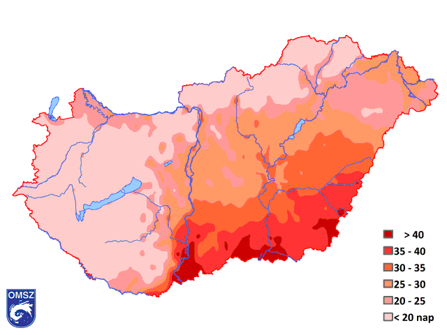 A nyári napok száma (Tmax ≥ 25 °C) meghaladta (90 nap) az 1981-2010-es átlagot (80 nap), hőségnapból (Tmax ≥ 30 °C) országos átlagban a normállal megegyező értéket jegyeztünk (24 nap). Az országos átlagnál jelentősen több hőségnap (10. ábra) az Alföld déli tájain fordult elő. 2016-ban forró napot (Tmax ≥ 35 °C) egyáltalán nem jegyeztünk, így ezzel elmaradtunk az 1981-2010 átlagtól (1 nap).