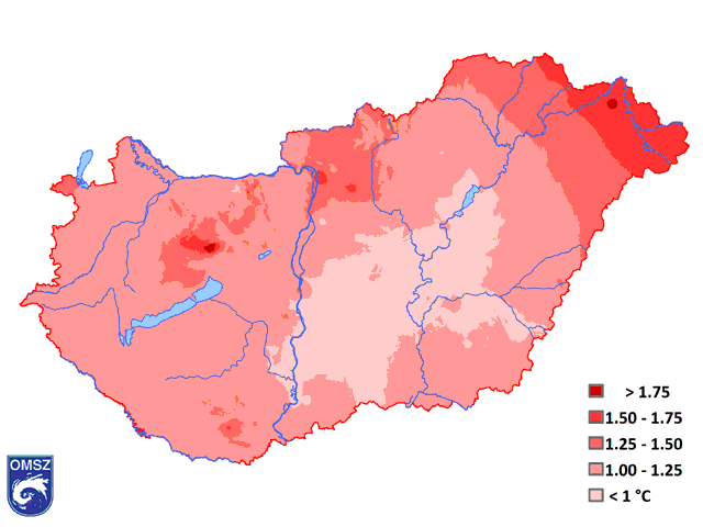A hőmérsékleti anomália túlnyomóan +1,0 – 1,7 °C között alakult 2016-ban. Az ország ÉK-i, K-i részén láthatóak a legmagasabb értékek (9. ábra), a határszélen 1,75 °C-nál is magasabb volt az eltérés mértéke. A megszokottnál hidegebb sehol sem volt éves átlagban, a legalacsonyabb értékek a Duna-Tisza közén és az Alföld középső tájain voltak jellemzőek, ahol az 1 °C-ot nem haladta meg a hőmérsékleti eltérés nagysága.