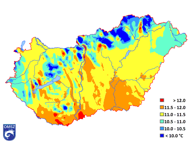 Az ország jelentős részét 11 °C-nál magasabb éves középhőmérsékletek jellemezték 2016-ban (8. ábra). A legmelegebb tájakat a déli országrészben találjuk, illetve kisebb medencékben, folyóvölgyekben, ahol 12 °C fölé emelkedett az évi középhőmérséklet. A magasabban fekvő hegyvidéki területeinken adódtak 10 °C-nál alacsonyabb évi átlagok.