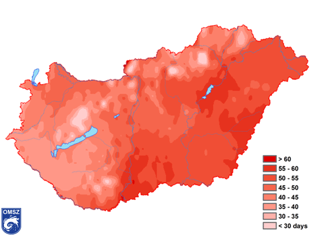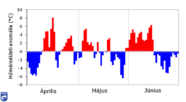 A nyári napok száma (Tmax ≥ 25 °C) meghaladta (87 nap) az 1981-2010-es átlagot (80 nap), hőségnapból (Tmax >= 30 °C) közel kétszer annyit, 46-ot regisztráltunk országos átlagban (10. ábra) a normálhoz képest (24 nap). A 13 forró nap (Tmax ≥ 35 °C) jelentősen meghaladja az országos átlagot (1 nap).
