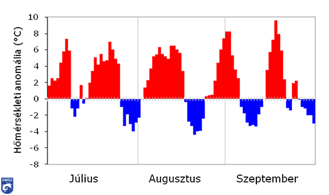 A havi országos átlaghőmérséklet 17.4 °C volt, ami 1.6 °C-kal magasabb a sokéves átlagnál. A Bakonyban kisebb területeken jelentkezett -0.5 – 0 °C-os negatív anomália, míg az ország többi részén pozitív irányú eltérés volt megfigyelhető. A Dunántúlon általában 0-1 °C-kal, a Duna-Tisza közén 1-2 °C-kal, a Tiszántúlon 2-3 °C-kal volt melegebb a hónap a megszokottnál. Szeptemberben az ország túlnyomó részén 16-18 °C-os középhőmérsékletet mértünk. A Tiszta mentén és az Alföld délkeleti részén, igen nagy területen jelentkeztek 19-20 °C közötti értékek. Hűvösebb területek a magasabb hegységeinkben voltak (13-16 °C), az Északi-középhegység legmagasabb pontjain 12 °C alatti értékeket is láthatunk a térképen. Érdekesség, hogy a hónap középét rendkívül meleg időszak jellemezte, szeptember 18-án Körösszakálon 37.3 °C-ot mértünk.
