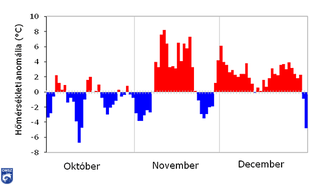 A szokásosnál melegebb (2.3 °C-kal) volt a decemberi időjárás. Az ország északkeleti felében az ilyenkor megszokott átlaghőmérsékleteknél 3-4 °C-kal is magasabb értékeket regisztráltunk. Hűvösebb körzetek az Északi-középhegység legmagasabb pontjain, főként a Bükkben és a Zempléni-hegységben voltak, de még ezeken a területeken is magasabb hőmérsékleti értékeket mértünk, mint az 1981-2010-es normálérték.