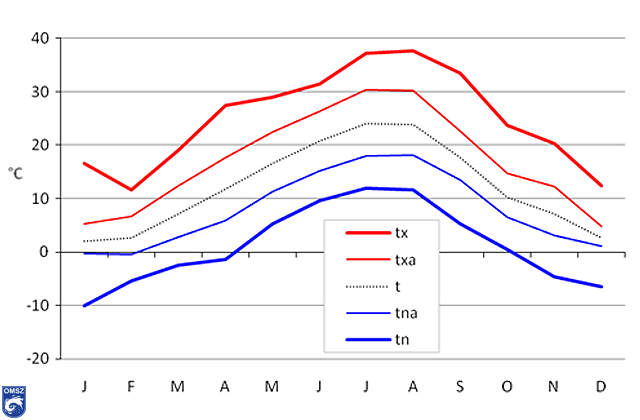 A 11. ábrán látható pestszentlőrinci állomásunk hőmérsékletének 2015. évi menete (tx – havi maximum, txa – maximumok havi átlaga, t – átlag, tna – minimumok havi átlaga, tn – havi minimum).