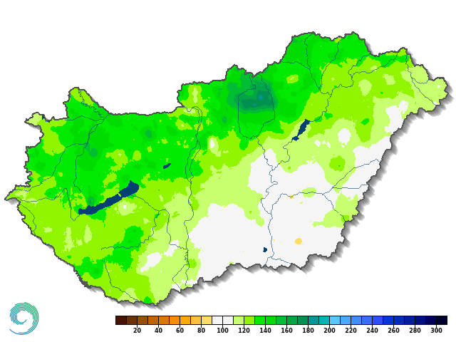 A 2023. évi csapadékösszeget az 1991-2020-as normállal összevetve elmondható (10. ábra), hogy az országon belül észak, északnyugat felől dél, délkelet felé haladva csökkent a csapadéktöbblet. A legnagyobb eltérést a Mátra térségében kaptuk, itt általában a megszokott mennyiség 150-190%-a hullott le. A Dunántúl északi felén 120-150%, déli részén 100-140%, míg az Alföldön a megszokott éves csapadék 100%-130%-a volt a 2023-as összeg. 2023-ban alig volt az átlagosnál szárazabb terület: az Alföldön kisebb foltokban az átlagos mennyiség 80-90%-a hullott az év során.