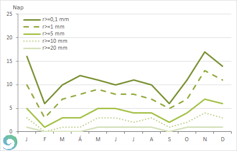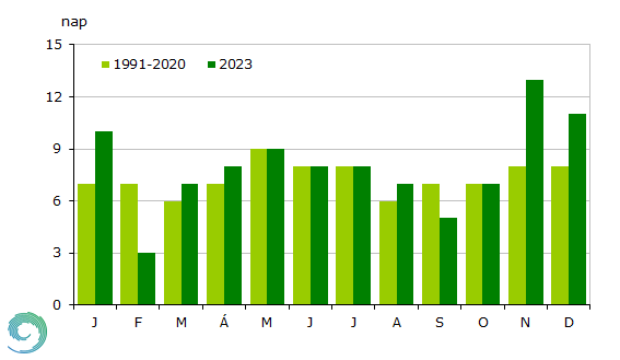 2023-ban 97 napon haladta meg a csapadék mennyisége az 1 mm-t, ami 11 nappal több az 1991-2020-as átlagnál (87 nap). A szokásos éves menet (13. ábra) szerint májusban kellene a legtöbb 1 mm csapadék feletti napot detektálnunk, melyet a június és a július követ. 2023-ban ezek a hónapok mind átlagosak voltak, emellett januárban, novemberben és decemberben a megszokottnál jóval magasabb értékeket kaptunk. Novemberben 13 ilyen nap volt, ami 5-tel haladja meg a normál értéket. A legkevesebb 1 mm-t meghaladó csapadékú nap februárban adódott, 7 nap helyett mindössze 3 volt.