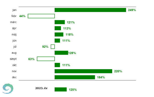 A csapadék éven belüli alakulását a 11. ábrán mutatjuk be. Hazánkban az 2023-ban a legszárazabb hónap a február lett, amit a második helyen a szeptember követett. Nyár elején, júniusban és júliusban szokott a legtöbb csapadék hullani, majd fokozatosan csökken a mennyiség az év végéig. Ezzel szemben 2023-ban a legcsapadékosabb hónap a november lett, amit a december követett, a harmadik legcsapadékosabb hónap pedig január volt, megelőzve a júniust.