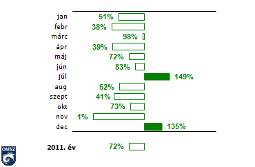 Szélsőségesen száraz évről tanúskodnak a 11. ábra értékei. Nem csak az év, hanem kettő kivételével (július és december) minden hónap csapadékdeficitet mutat. A legszembeszökőbb a novemberi 1%-os érték, amikor is országos átlagban az egész havi csapadékösszeg az 1 mm-t sem érte el, csupán 0.4 mm volt. Ezzel a november az elmúlt 111 év legszárazabb novembere lett. Az eddigi novemberi szárazsági rekordot az 1924-es 9 mm-es csapadék tartotta, ami még mindig tetemes mennyiségnek számít a 2011. novemberi összeghez képest. Ezzel együtt az ősz is rendkívül száraznak bizonyult, csapadékhozama a második legkisebb volt a mérések kezdete óta.
