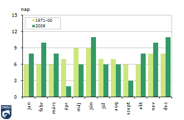 2009-ben országos átlagban 125 napon hullott csapadék (>=0,1 mm), ami 12-vel több a vártnál. A hónapok közül általában májusban, júniusban számláljuk a legtöbb csapadékos napot, ezzel szemben tavaly decemberben esett a legtöbb napon, mintegy 15 alkalommal, ami 4-gyel több a sokéves átlagnál. A legkevésbé esõs hónapnak az április bizonyult, országos átlagban csupán 4 napon észleltek csapadékot az ekkor szokásos 10 helyett, holott általában az augusztus-október idõszakban fordul elõ a legkevesebb csapadékos nap. Az 1mm-nél nagyobb csapadékhozamú napok tekintetében (15. ábra) hasonló észrevételeket tehetünk. Ebben az esetben a decemberben tapasztalt küszöbnapok száma (11 nap) megegyezett az általában elsõ helyezett, június értékeivel.