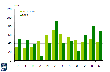 Országos átlagban a legtöbb csapadék az 1971-2000-es normálnak megfelelõen júniusban hullott és az õsz végi másodmaximum is megjelent. 5 hónap volt szárazabb a vártnál, ezek közül is az április tûnik ki leginkább, amikor a jellemzõ havi érték a 10 mm-t is alig érte el. Ezzel 2009-ben a szokásos február helyett ez lett az év legkevésbé csapadékos hónapja.