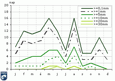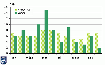 A különbözõ küszöbértékeket meghaladó csapadékú napok átlagos számát mutatjuk be a 14. ábrán az év hónapjaiban országos átlagban. A mérhetõ csapadékmennyiségû (>=0,1mm) napok számánál lényegesen kisebb értékeket kapunk, ha az 1 mm-t meghaladó hozamú napokat számoljuk össze. Ennél is kevesebb esetben észleltek a mezõgazdaság szempontjából is mértékadó mennyiségû (>=5mm) csapadékot. A 2006. évben a legtöbb csapadékos nap májusban és augusztusban, a legkevesebb pedig szeptemberben, októberben és decemberben fordult elõ.