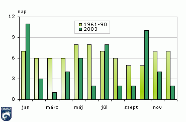 A 2003-ban elõfordult 1 mm-nél nagyobb csapadékhozamú napok számát hasonlítottuk össze a sokévi átlaggal a 12. ábrán. Lényegesen nagyobb esetszám volt január és október hónapokban. 2003-ban nem júniusban, hanem júliusban és októberben esett a legtöbb esõ (10. ábra), ami együttjárt a csapadékos napok számának növekedésével is.