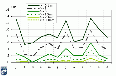 A különbözõ küszöbértékeket meghaladó csapadékú napok átlagos számát mutatjuk be a 11. ábrán az év hónapjaiban országos átlagban. A mérhetõ csapadékmennyiségû (>=0,1 mm) napok számánál lényegesen kisebb értékeket kapunk, ha az 1 mm-t meghaladó hozamú napokat számoljuk össze. Ennél is kevesebb esetben észleltek a mezõgazdaság szempontjából is mértékadó mennyiségû (>=5 mm) csapadékot.