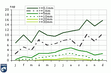 A különbözõ küszöbértékeket meghaladó csapadékú napok átlagos számát mutatjuk be a 11. ábrán az év hónapjaiban országos átlagban. A mérhetõ csapadékmennyiségû (>= 0.1 mm) napok számánál lényegesen kisebb értékeket kapunk, ha az 1 mm-t meghaladó hozamú napokat számoljuk össze. Ennél is kevesebb esetben észleltek a mezõgazdaság szempontjából is mértékadó mennyiségû (>=5 mm) csapadékot.