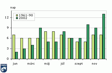 A 2002-ben elõfordult 1 mm-nél nagyobb csapadékhozamú napok számát hasonlítottuk össze a sokévi átlaggal a 12. ábrán. Lényegesen nagyobb esetszám volt április, október és december hónapokban. A három hónap közül csak októberben haladta meg a csapadék havi összege a szokásos értéket (10. ábra). 2002-ben nem júniusban, hanem augusztusban esett a legtöbb esõ (10. ábra), az viszont nem járt együtt a csapadékos napok számának növekedésével.