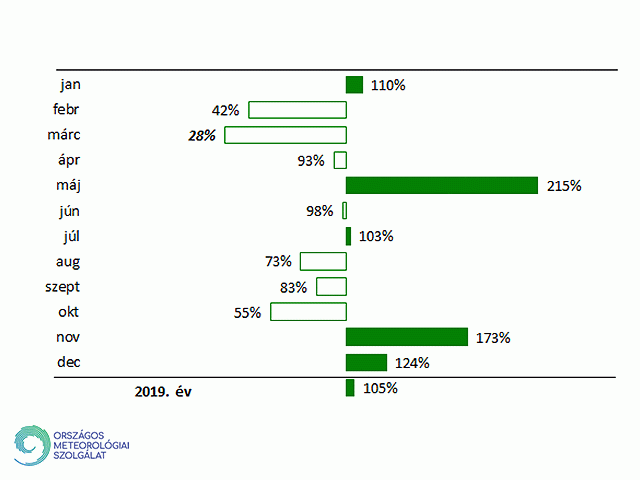Az országos évi csapadékösszeg 2019-ben 631 mm-nek adódott, mely az 1981-2010-es sokévi átlag 105%-a (12. ábra). A 2019-es év így a 71. helyre került a legkisebb évi csapadékösszeggel kezdődő 119 év hosszú éghajlati sorban. Az év során májusban és novemberben érkezett kiemelkedő mennyiségű csapadék, míg extrémen száraz volt a március (12. ábra). Az év egy átlagosan csapadékos januárral kezdődött, majd februárban és márciusban már alig esett az eső. Februárban a sokévi átlag alig 40%-a hullott, márciusban pedig még annál is kevesebb (28%). A 2019. évi március a 10. legszárazabb március lett 1901 óta a homogenizált adatsor szerint. A tavasz második hónapjától megérkezett a korábban hiányzó csapadék. Az április már átlagosan csapadékos lett, míg májusban kinyíltak az égi csatornák, és az 1981-2010-es sokévi átlag több mint duplája zúdult le (215%). A májusi országos csapadékösszeg 134 mm volt, így 2010 és 1939 májusa után a 2019. évi a 3. legcsapadékosabb május a rangsorban 1901 óta. 2019 nyarának első két hónapjában összességében a normálértékhez hasonló mennyiségű csapadék érkezett, időben azonban igen koncentráltan. A nyári hónapokban gyakoriak voltak a felhőszakadások és jégesők. 2019-ben összesen 7 napon hullott 100 mm-t meghaladó mennyiségű csapadék az OMSZ mérőállomásain. Az özönvízszerű eső több településen is károkat okozott. Augusztusban a bükki felhőszakadások ellenére országos átlagban a sokévi átlagnál 30%-kal, míg szeptemberben 20%-kal kevesebb csapadék hullott. Október ismét nagyon száraznak adódott, a szokásos csapadékmennyiség csupán fele (55%) hullott le. A november és a december már az átlagosnál csapadékosabban telt. A 2019. novemberi csapadékösszeg országos átlagban elérte a 85 mm-t, amely a sokévi átlag 173%-a. 2019 decemberében a csapadékos november után újra viszonylag sok csapadék érkezett, a hónap elején hó formájában. A havi csapadékmennyiség országos átlagban 58 mm volt, ami 11 mm-rel több az ilyenkor szokásos csapadékmennyiségnél (47 mm). December 15-én a Kékestetőn a hóréteg legnagyobb vastagsága 21 cm volt (12. ábra).