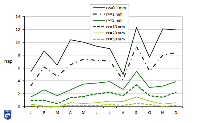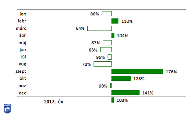 A csapadék éven belüli eloszlásának megváltozását a 15. ábrán mutatjuk be. Hazánkban a sokévi átlagok alapján a legszárazabb hónapok általában a január és február. A nyár elején, júniusban szokott a legtöbb csapadék hullani (elsődleges csapadékmaximum), majd az októberi kicsit szárazabb időszak után novemberben egy második csapadékmaximum azonosítható, bár mértéke sokéves átlagban is csökken. 2017-ben a tél végén február kicsit csapadékosabb volt, míg a tavaszi hónapok csapadékmennyisége elmaradt a sokévi átlagtól, különösen márciusban. A legcsapadékosabbnak várt június mellett az összes nyári hónap szárazabb volt, és szeptemberre érkezett meg a jelentősebb csapadék. Az őszre várt másodlagos csapadékmaximumot ezúttal decemberben figyelhettük meg.