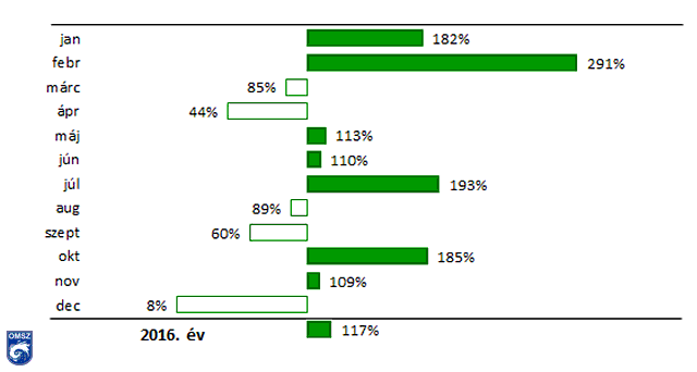 A 15. ábrán jól látszik, hogy a csapadék éves menetében jelentős eltérések vannak a sokéves átlagokhoz képest. Hazánkban a normál alapján a legszárazabb hónap általában a február. A nyár elején, júniusban szokott lenni az elsődleges csapadékmaximum, majd novemberben egy másodmaximum. 2016-ban ezúttal mindkét év eleji téli hónapban jóval több csapadék érkezett, mind szokott. Kimagaslóan sok februárban. A tavaszi hónapok csapadékmennyisége elmaradt a sokévi átlagtól, különösen áprilisban. 1901 óta a 2016-os április a 11. legszárazabb hónap. A legcsapadékosabbnak várt június helyett a július lett a legcsapadékosabb nyári hónap. A nyár vége és szeptember igen szárazan telt. Az őszi csapadékmaximumot ezúttal októberben figyelhettük meg. Az év végén pedig, december a hosszú idősorban a második legszárazabb hónap volt.