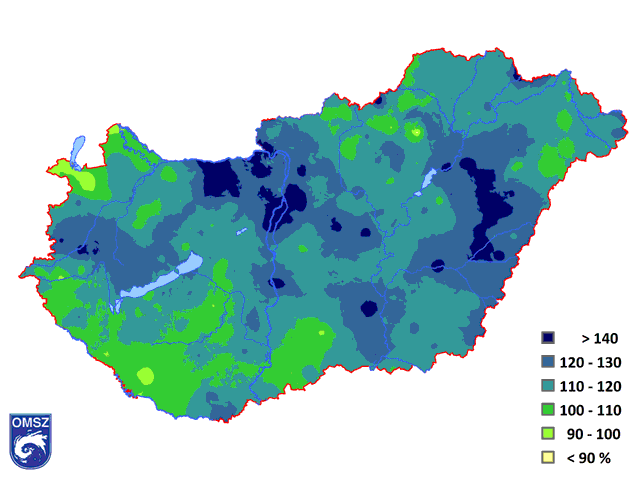 Az 1981-2010-es normált és a 2016-os értékeket összevetve elmondható, hogy az ország jelentős részén a megszokott mennyiségnek 100-120%-át jegyeztük. A Tiszántúlon, a Hajdúságban, a középső országrészében, a Csepel-sziget északi részén, a Gerecse területén fordult elő a normálnál jóval nagyobb csapadékösszeg, helyenként a szokásos mennyiség 140%-a. A sokévi átlagnál kissé kevesebb csapadék a Fertő-tó térségében és helyenként a Dél-Dunántúlon hullott (14. ábra).