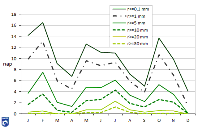 A csapadékviszonyokat jól jellemezhetjük a csapadékmennyiség mellett a csapadék-küszöbnapok számával is (16. ábra). Nyáron, júliusban jegyeztünk a legtöbb 30 mm feletti napi csapadékösszeget, amikor főként gyors záporokból és zivatarokból származott csapadék. Az év során a legtöbb csapadékos nap (> 0,1 mm) februárban, illetve októberben fordult elő.