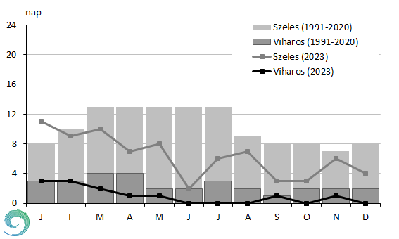 A szélviszonyokat jellemző küszöbnapok éves menetét a 17-19. ábrákon mutatjuk be. 2024-ben Budapest Pestszentlőrincen összesen 76 szeles nap (napi maximális széllökés (fx ≥ 10 m/s) volt, ami 36%-kal marad el a megszokottól. A legtöbb szeles napot januárban jegyeztük az állomáson 11 nappal, mely 3 nappal haladta meg az ilyenkor szokásos értéket. Ezt követte a március és a február, amikor 10 és 9 szeles nap fordult elő, az előbbi 3 míg az utóbbi 1 nappal maradt el az átlagtól. A legkevesebb, 2 szeles napot júniusban regisztráltunk, ami jelentősen elmarad a szokásos 13 naptól, annak mindössze 15%-a. Szeptemberben és októberben is szokatlanul kevés, mindössze 3 szeles nap adódott, a megszokott 8 helyett.