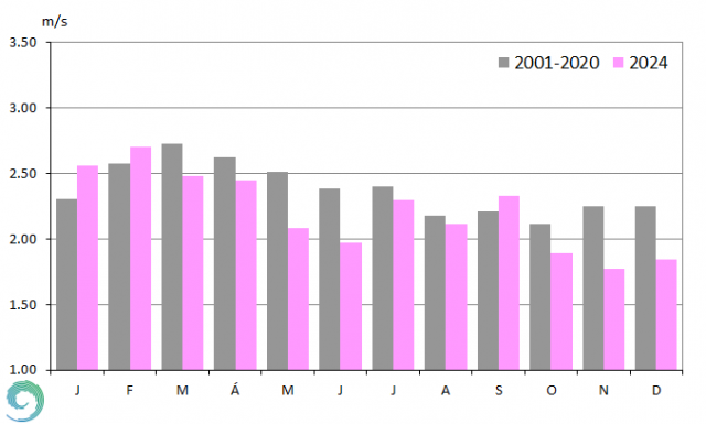A szélsebesség évi átlaga hazánk területén többnyire 1,5 és 3,5 m/s között változott, az országos átlag 2001-2020 között 2,6 m/s volt, míg 2024-ban 2,4 m/s-nak adódott. A legmagasabb évi átlagok a Dunántúl északi részén és a Tiszántúlon voltak jellemzőek, ahol nagyobb összefüggő területen a szélsebesség elérte a 3 m/s-ot. A Dunántúli-középhegység magasabban fekvő csúcsai esetén előfordultak 4 m/s-ot meghaladó értékek is. A szélsebesség átlagos éves menetét jól mutatják a szürke oszlopok a 14. ábrán. Január elejétől márciusig növekszik az országos átlag, majd augusztusig csökken, és újra növekedni kezd egészen az év végéig. 2024-ben az országos szélsebességek havi átlagai januárban, februárban és szeptemberben haladták meg a sokévi átlagot. Márciustól egészen augusztusig és októbertől az év végéig a havi szélsebesség értékek elmaradtak az átlagtól, a legnagyobb eltérés május, június majd november, december hónapokban volt jellemző. A legalacsonyabb átlagos szélsebesség novemberben volt (~1,77 m/s), amit a december (~1,84 m/s) és a június (~1,89 m/s) követett. A legjelentősebb pozitív eltérés januárban adódott, míg a legszelesebb hónap a február volt (>2,7 m/s).