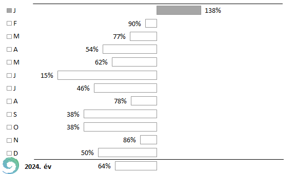 A 15. ábrán jól látható, hogy Budapest Pestszentlőrinc állomáson a 2001-2020 közötti átlaghoz viszonyítva februárban és szeptemberben alig haladta meg a szélsebesség a megszokott értéket, csupán januárban volt 10%-ot meghaladó a havi átlagos szélsebesség normáltól való eltérése. A többi hónapban az átlagos szélsebesség kisebb volt, a legnagyobb eltérés novemberben adódott, ezt követte a december, majd holtversenyben a május, június. Végeredményben elmondható, hogy mind országos átlagban, mind Budapest Pestszentlőrincen is az átlagosnál kevésbé volt szeles a 2024-es év.